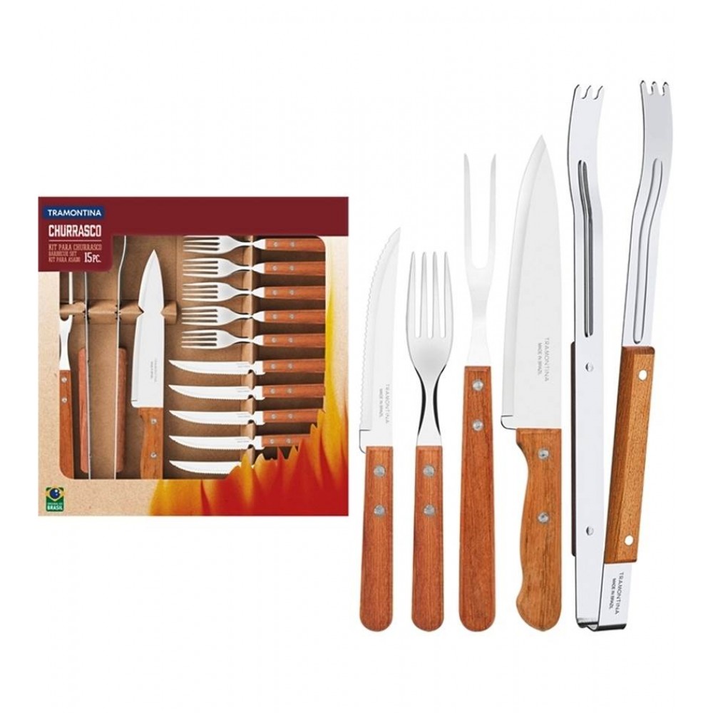 Conjunto 15 Peças Para Churrasco Tramontina Cabo De Madeira Natural